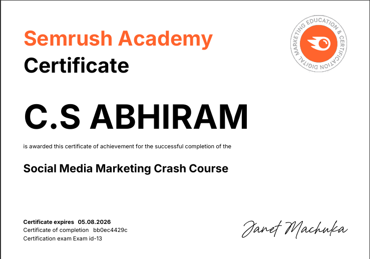 I’m Abhiram Sajan, Best Digital Marketing Expert in Thrissur. I help entrepreneurs and business owners build a strong online presence with Best strategies. I mainly focus on Return on Investment (ROI) — they get back what they invested for. I am an expert in SMM, SEO, GoogleAds, and Email Marketing. I began my digital marketing journey at Dotin Digital Academy, where I received hands-on practical experience from my projects. Now I know how to reach the correct audience for a business. If you are looking for the best, I’m here to elevate your business journey.